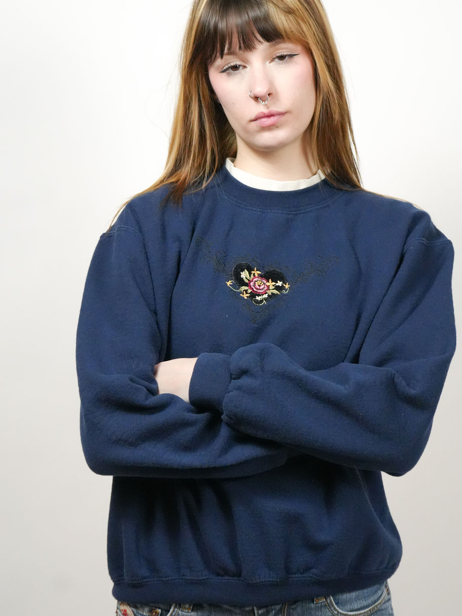 M VINTAGE 90S FLOWER HEART EMBROIDERED NAVY CREWNECK